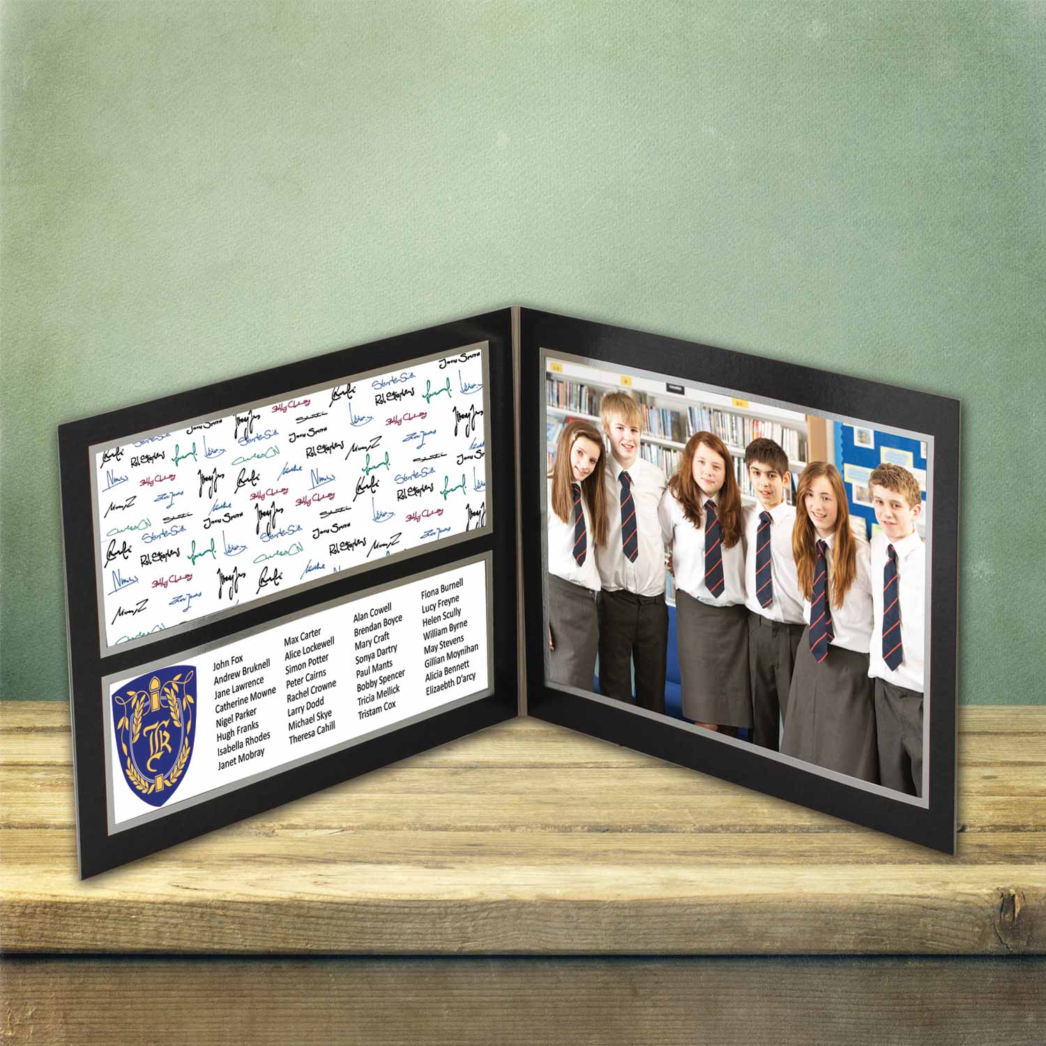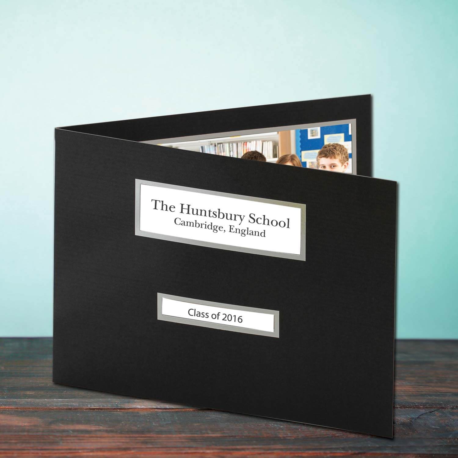 Specially designed folder style mount for school leavers photography. Heavyweight black board with silver line bled in around aperture. The right hand side takes a 12" x 8" photo and the left side is split into 2 apertures. The front cover also has two apertures for displaying the school name, year and other relevant information.