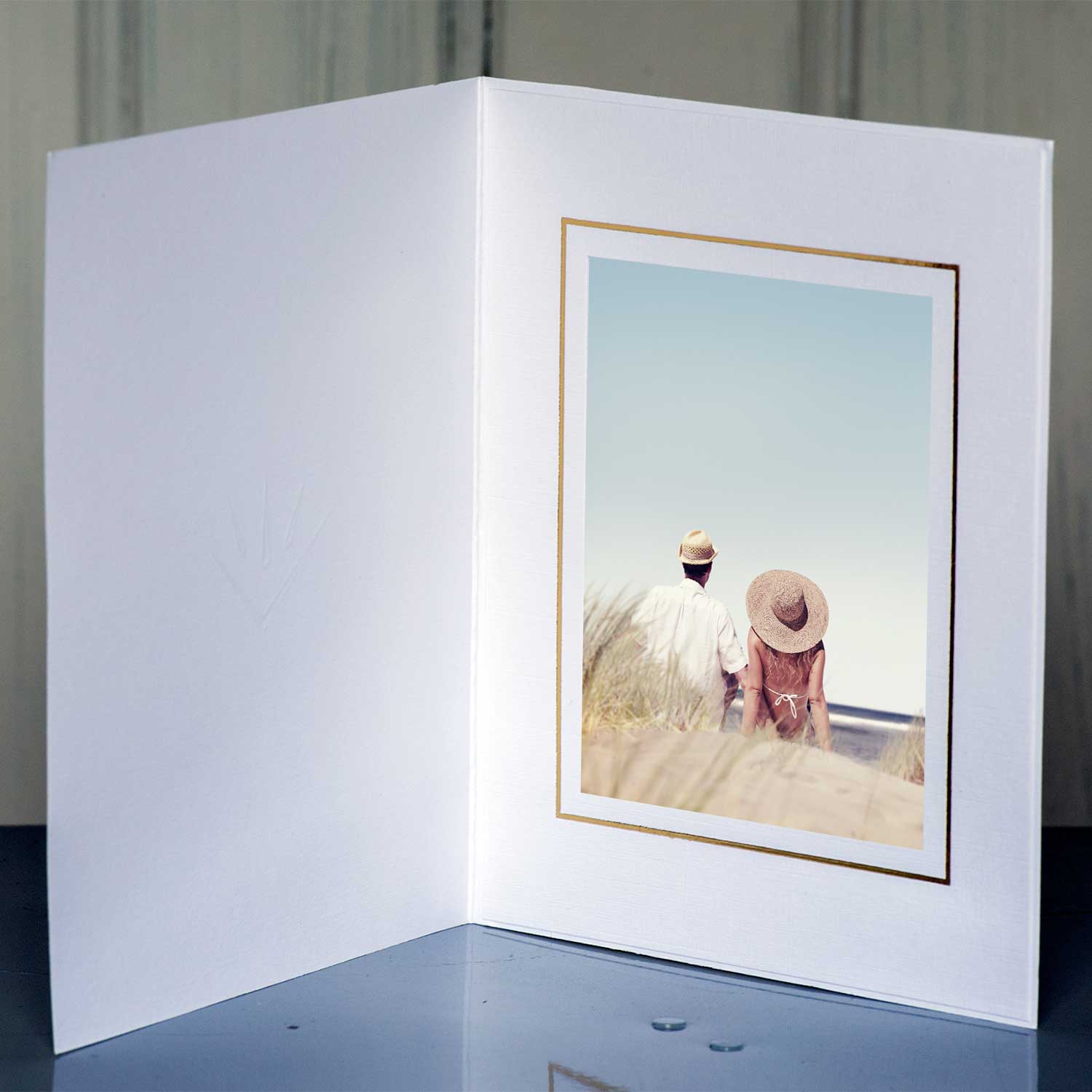 Quality standard weight slip in folder with single gold line around the aperture. There is a complete range of sizes available and all can be personalised with your details free of charge.